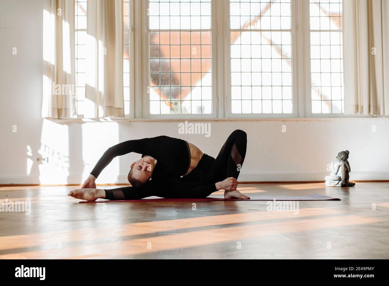 Junge Frau Yoga Asana Gedrehten Kopf Auf Knie Parivrtta Janu Sirsasana Stockfotografie Alamy